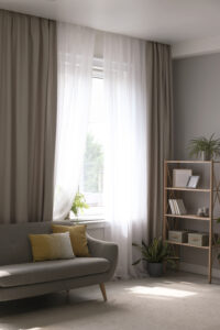 Para salas de estar com função representativa, as cortinas de linho e voil continuam sendo as escolhas estéticas mais versáteis — desde que instaladas com forro técnico de blackout ou tela solar por trás, que assume a função de controle térmico sem aparecer quando as cortinas estão abertas. Esse sistema de camadas é o mais usado em projetos de interiores de alto padrão justamente porque entrega os dois resultados sem concessão.